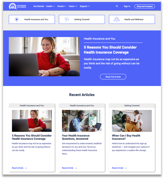 I led the development of a comprehensive content marketing strategy that segmented the target audience into personas, identifying their unique needs and financial challenges in relation to health insurance. We designed and built a rich content experience for CoveredCA.com, featuring a mix of custom articles, videos, and infographics. The content was written in clear, simple language to answer common healthcare questions and eliminate jargon.